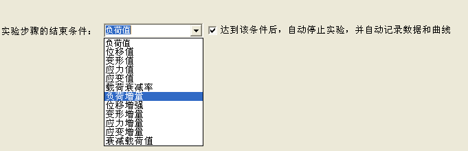 2.实验步骤的结束条件,可选择:负荷值、位移值、变形值、应力值、应变值、载荷衰减率、负荷增量、位移增强、变形增量、应力增量、应变增量、衰减载荷值等,达到该条件后,自动停止实验,并自动记录数据和曲线,